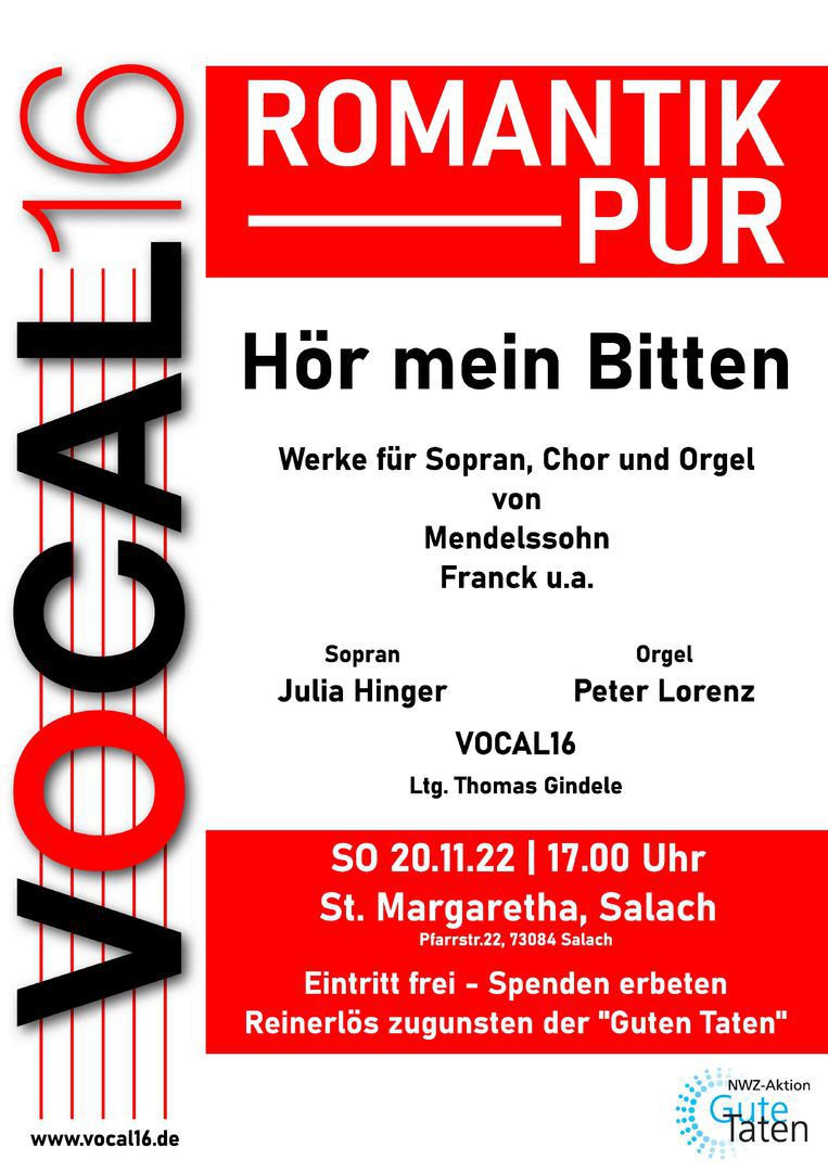 Wir gestalteten zusammen mit der Sopranistin Julia Hinger ein Konzert mit Werken für Sopran, Chor und Orgel. An der Orgel begleitete Peter Lorenz und spielte Werke von Felix Mendelssohn, Cäsar Franck u.a. Die Gesamtleitung hatte KMD Thomas Gindele.