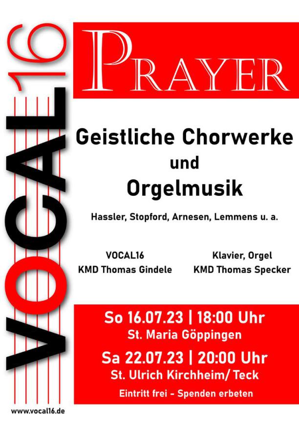 Prayer -Gebet- ist der Titel des Konzertes, mit dem das Vocal16-Ensemble seine Zuhörer auf eine Reise durch Chormusik aus fünf Jahrhunderten nehmen möchte. Zu Beginn erklingt der „Flight Song“ des norwegischen Komponisten Kim André Arnesen, in dem die in jedem verborgene Musik besungen wird. Ihm wird der Renaissance-Komponist Hans Leo Hassler mit seiner „Missa Dixit Maria II“ als Kontrast entgegengesetzt. Unterteilt werden die Messteile durch Orgelversetten von Johann Ernst Eberlin, einem Komponisten des Barock, von KMD Thomas Specker an der Orgel gespielt. Es folgen ein „Salve Regina“ von Max Baumann, sowie zwei Werke des Briten Philip Stopford- „In my Fathers House“ und eine Vertonung des Psalm 100 „Jubilate“. Max Baumanns „Salve Regina“ besticht durch seinen inniglichen Beginn, das durch die flehentliche Bitte an die Gottesmutter, sich nicht abzuwenden, einen musikalischen Höhepunkt erreicht, um zum Schluss wieder zu seinem ruhigen fließenden Klang voller Zuversicht zu kommen. Weitere Orgelstücke der Komponisten Cesar Franck und Nicolas Jacques Lemmens, welcher in diesem Jahr 200 geworden wäre, komplettieren das Programm, bevor der Chor mit dem “Irish Blessing” von James Edward Moore und “Evening Hymn” von Bob Chilcott das Konzert beschließt.